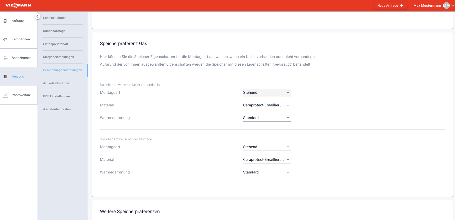 Heizlastberechnung - Indiviuelle Einstellungen