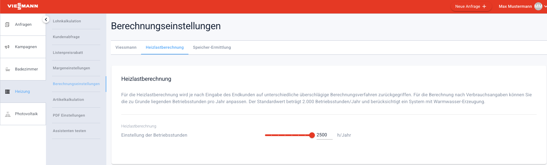 Berechnungseinstellungen finden Sie ab sofort die Möglichkeit, für die Heizlastberechnung eigene Werte für die zu berechnenden Betriebsstunden der Wärmeerzeuger einzustellen. Im Standardfall gehen wir von durchschnittlich 2000 Betriebsstunden in der Kalkkulation aus. Die Anpassung entspricht einer Vielzahl von Kundenwünschen, denen wir hiermit gern nachkommen.